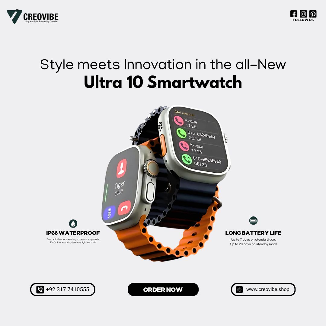 Stay connected and stylish with the Ultra 10 Smartwatch. Designed for durability and performance with IP68 waterproof rating, crystal-clear display, and long-lasting battery life—your perfect everyday smart companion.
